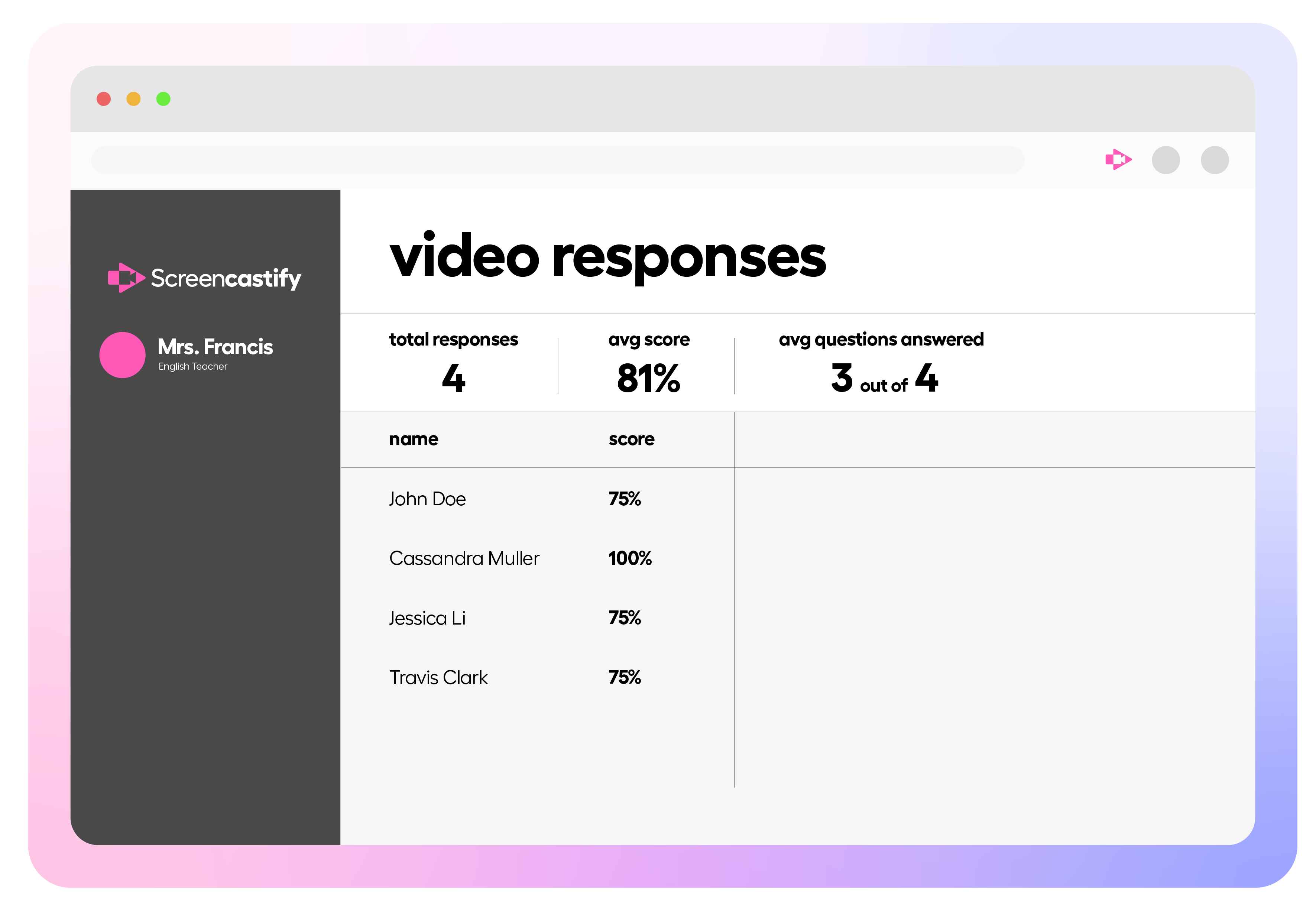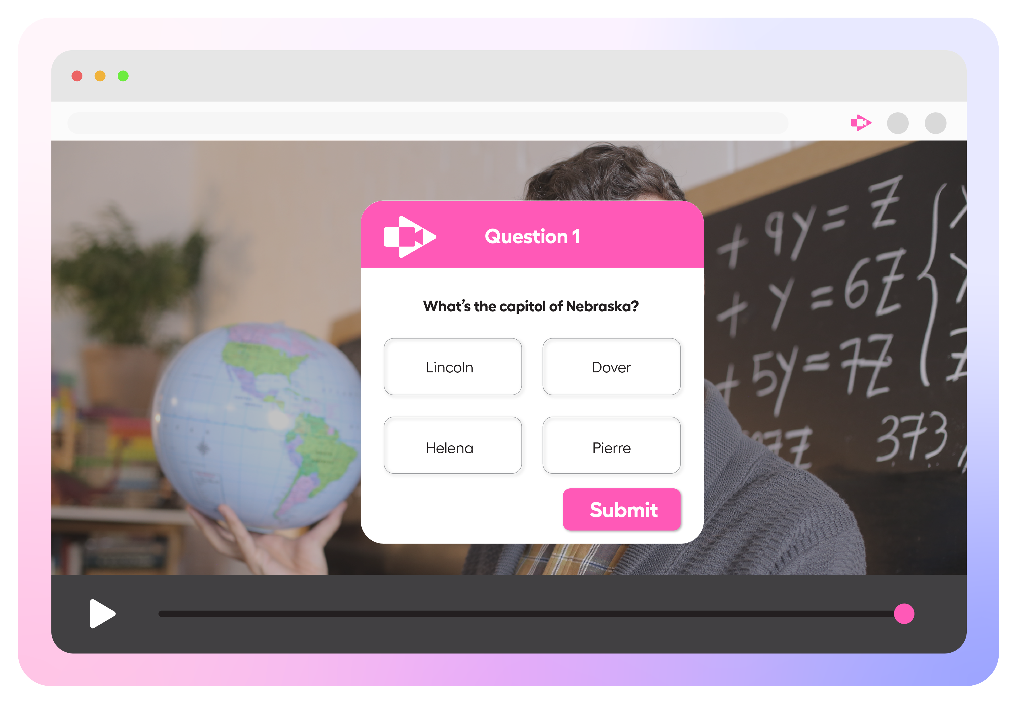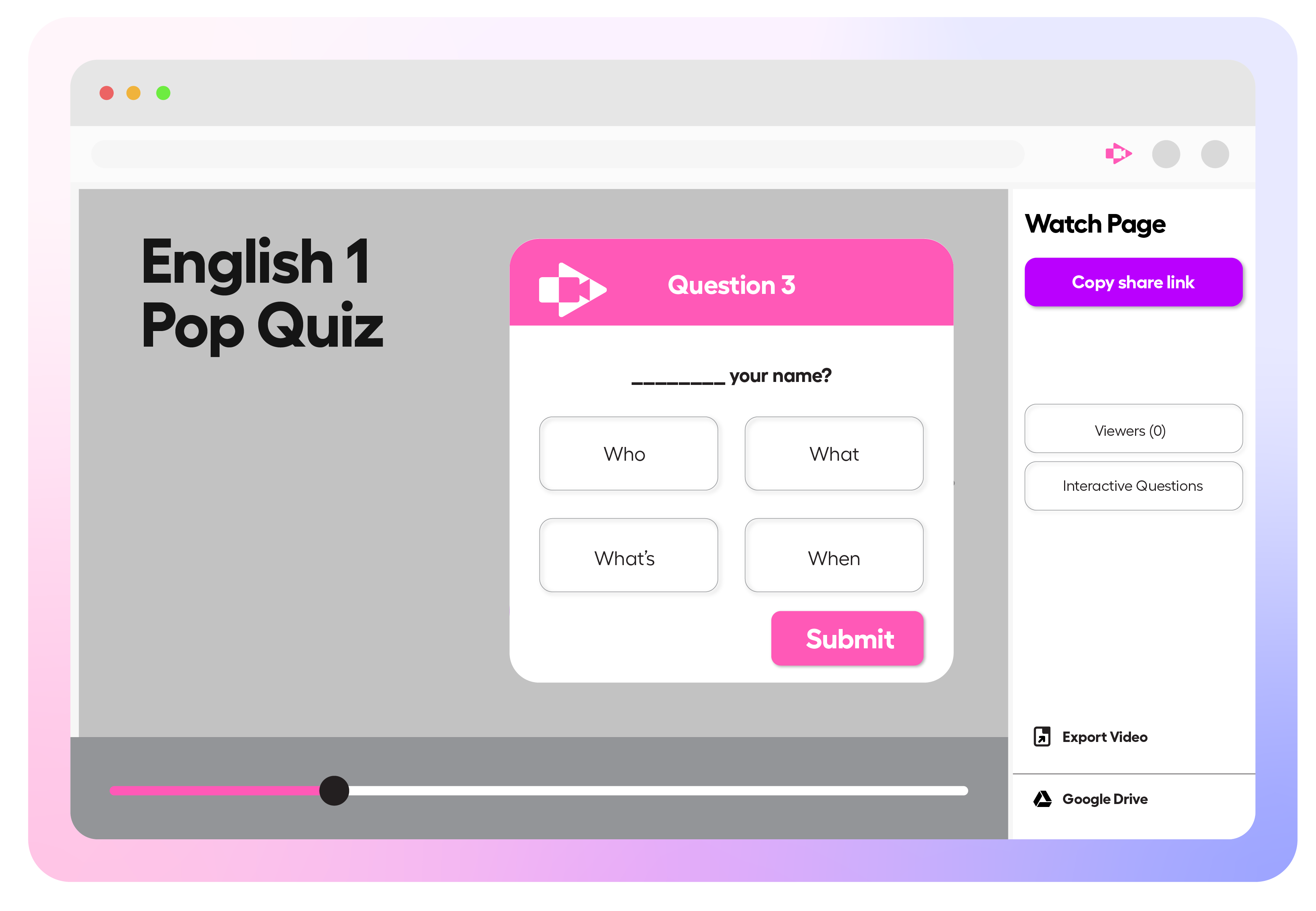 Easily add custom multiple choice and short answer questions to any timestamp in your video. Test student understanding: