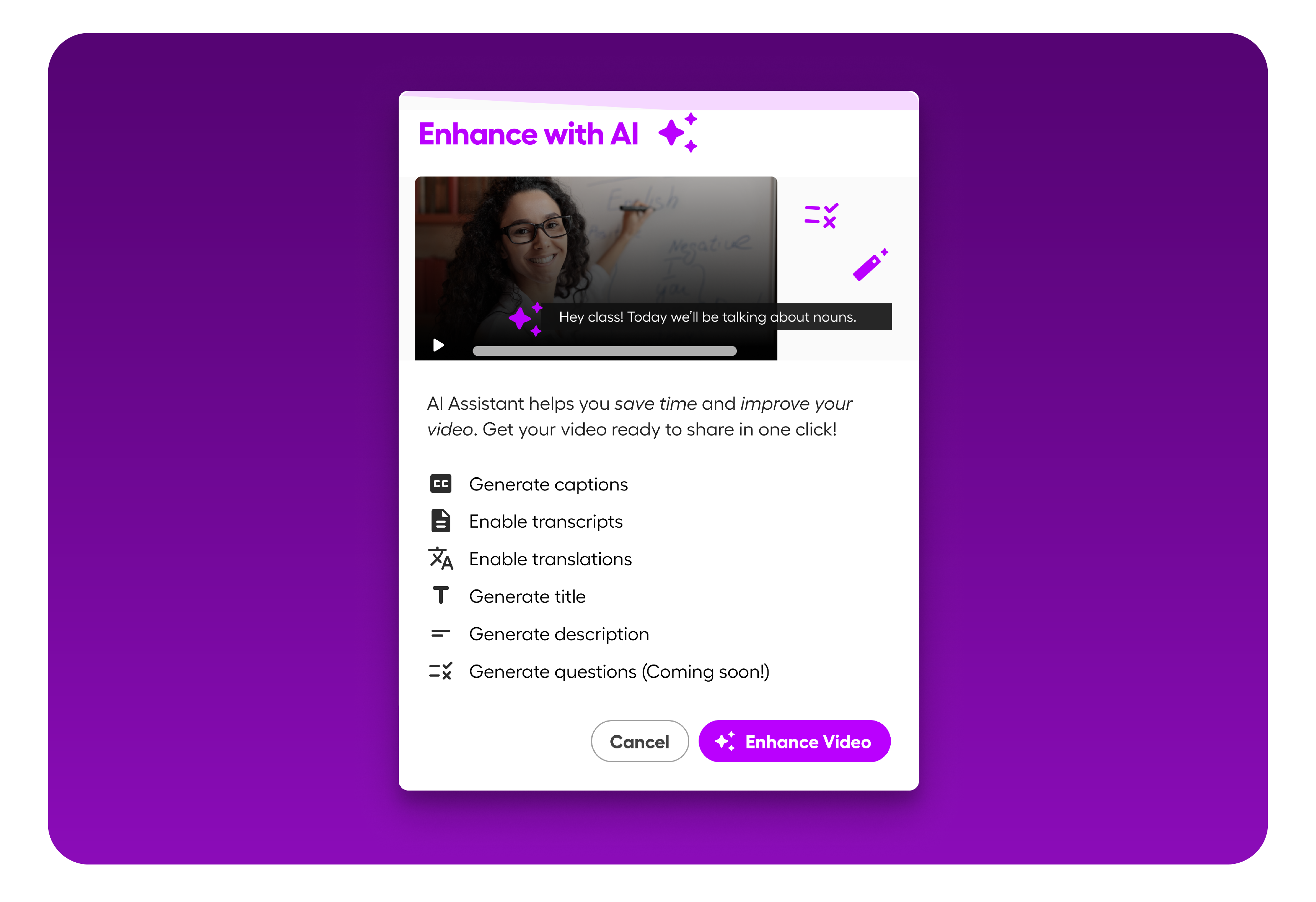 Our AI features save teachers time by automatically generating transcripts, translations, comprehension questions, and multilingual voiceovers. This makes it easier to personalize instruction and support every learner’s journey to proficiency.