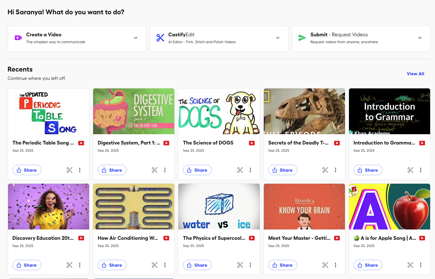 We’ve redesigned the Screencastify homepage to bring all your tools together in one easy-to-navigate hub. Create, edit, share, request videos, or launch assessments—all from a single screen. You’ll also see your most recent projects front and center, so you can jump right back into your work.